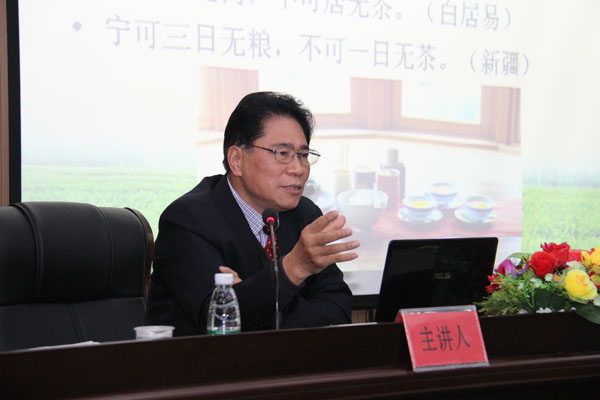 (中国茶叶流通协会副会长、湖南省茶业协会会长、茶祖神农基金会副理事长曹文成先生在授课)