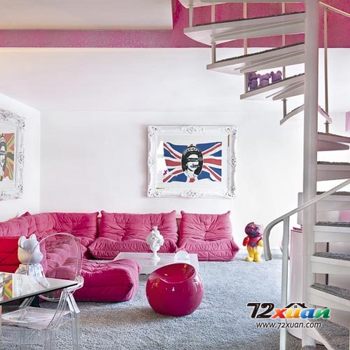 白色的墙面,灰色的地毯,这样的空间里,连成一片的粉红沙发套装和粉红的小圆椅成为了色彩的一大亮点,非常显眼。这种独特的色彩很好的融入了客厅的色调,看上去柔美舒服,并带有粉色的甜蜜。