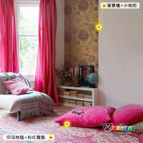 客厅的一角可以打造成一个宁静的小空间。靠着床边放张小沙发,悠闲时看看外边的风景,或是拿本书翻一翻,生活舒适而写意。粉色的窗帘和靠垫的点缀让原本有些沉闷的空间焕发了活力。
