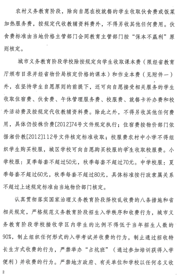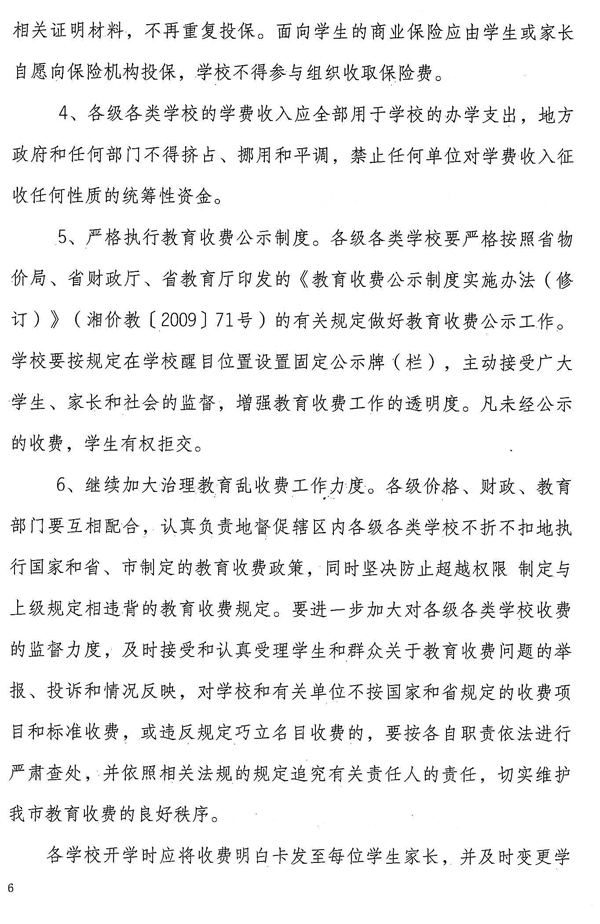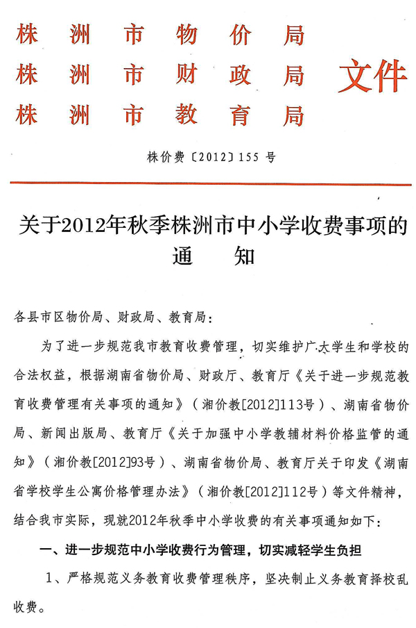 为了规范中小学教育收费管理,落实惠民利民相关政策,切实减轻学生家长负担,现将株洲市物价局、株洲市财政局、株洲市教育局《关于2012年秋季株洲市中小学收费事项的通知》(株价费[2012]155号)文件转发给你们,请遵照执行。并结合我县市场价格水平暂定伙食费按菜金2.5元/生·餐,大米以交实物为主,如交钱按2012年9月市场米价折算,期末按“不盈利”原则执行多退少补;如属自带饭菜需加热的学生可收取饭菜加热服务费50元/期·生。各学校开学时应将收费明白卡发至每位学生家长,并及时变更学校收费公示栏相关内容。