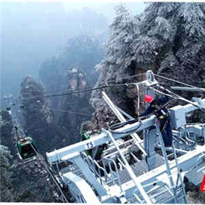 近日,受冷空气影响,湖南张家界武陵源风景区出现冰雪天气,当地旅游部门和景区企业加大对高空索道等游览运输工具的安全巡检力度。12月9日,黄石寨索道检修工在冰雪天气对索道进行巡检,及时排除冰雪天气带来的安全隐患,保障游览安全。(红网)