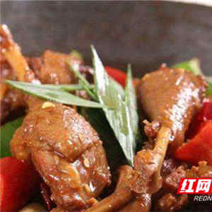 鲜美的鸭肉不是临武的专属,在资兴,干锅土匪鸭更有机会被列入团年饭的菜单中。鸭子砍小块,在烧锅里加香料炒干放到盆里,搭配黄豆芽,用锅炒5分钟、放水焖10分钟后放啤酒,佐以芹菜、蒜苗、小葱、香菜、淋红油,即可上桌品用。(红网)