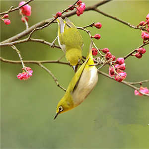 2月26日,在衡阳市雁峰区五星村的梅花树上,一只绣眼鸟正在枝头采食花蜜。早春时节,雁峰区五星村的梅花盛开正旺,不时有小鸟停落在枝头采食花蜜、玩闹,鸟儿与红梅相映成趣,春的气息扑面而来。(红网)