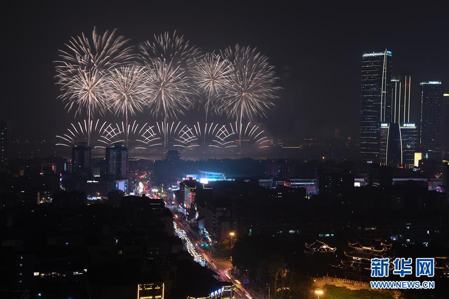 4月23日,长沙橘子洲燃放的烟花与长沙城区的天心阁交相辉映。当日,长沙橘子洲举行焰火晚会迎接“中国航天日”。(红网)
