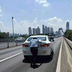 24日午间,一辆白色电动车突然停在长沙波隆立交桥的路中间。开福巡逻交警独自奋力推车前行,直至推到不影响交通的地方,确保道路的畅通。持续高温,路面温度高达40摄氏度以上,交警推车时已全身湿透。(红网)