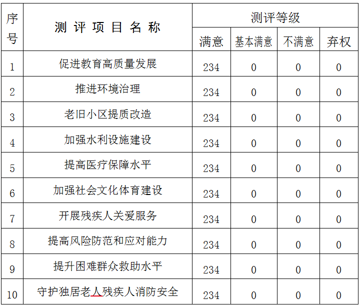 2026年1月27日,茶陵县第十八届人民代表大会第七次会议听取和审议了茶陵县人民政府关于2025年民生实事事项完成情况的报告,并对代表票决通过的10个项目进行了满意度测评,大会发出测评票(234)张,收回测评票(234)张,有效票(234)张,无效票(0)张。测评结果如下: